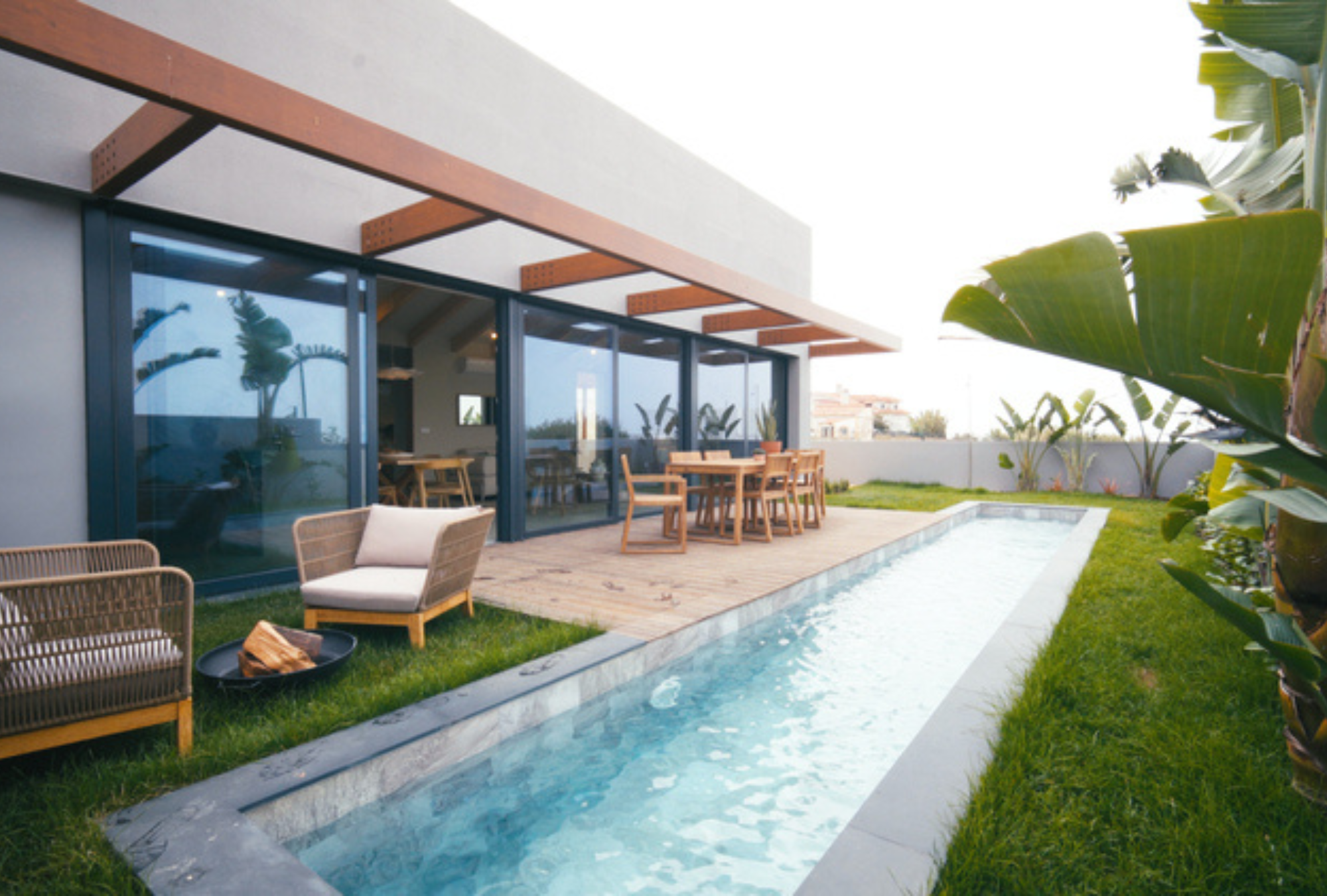 Integração técnica de piscinas, jardins e zonas de lazer que expandem a área útil da habitação.